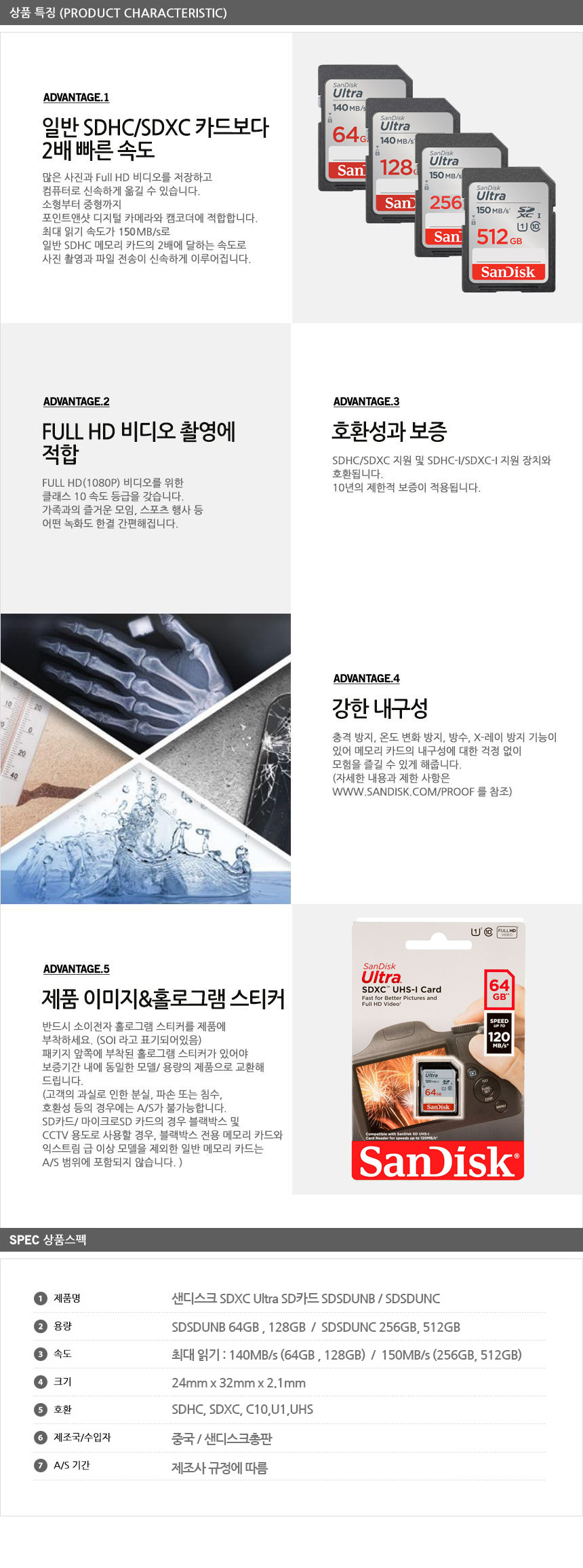■ 주요사양 : 일반 SDHC/SDXC보다 2배빠른속도/FHD비디오촬영/강한내구성